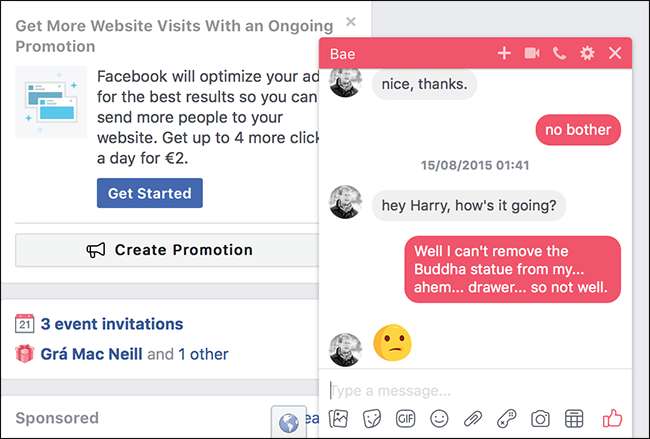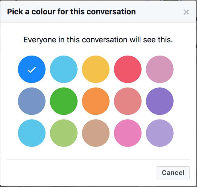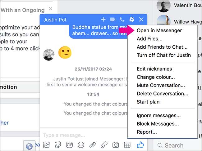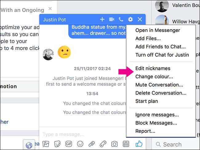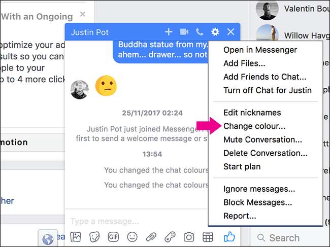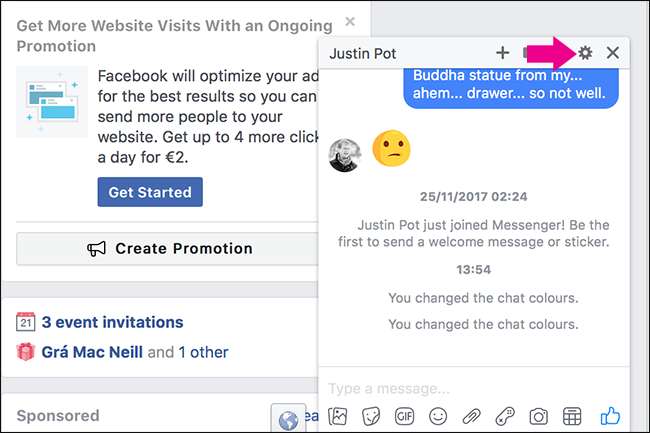 Перейдите в Facebook и откройте чат, который хотите настроить, затем щелкните значок шестеренки в правом верхнем углу.