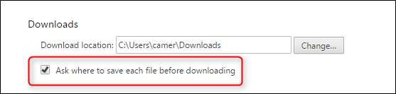 Если вы предпочитаете выбирать, куда загружать каждый файл отдельно - что я предпочитаю - просто установите флажок «Спрашивать, где сохранить каждый файл перед загрузкой». Бум, бац, готово.