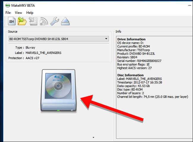 Чтобы скопировать фильм, вставьте диск в дисковод Blu-Ray и откройте MakeMKV. Через мгновение появится большой значок привода Blu-Ray. Щелкните здесь, чтобы сканировать заголовки на вашем диске.