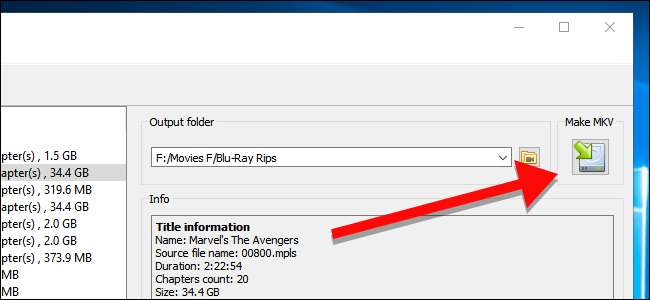 Затем в правой части окна выберите папку, в которую вы хотите поместить файл MKV. Это должно быть на жестком диске, на котором достаточно свободного места. Вы можете увидеть примерный размер файла в разделе «Информация», но предположим, что вам понадобятся дополнительные 20+ ГБ или около того на всякий случай (которые вам понадобятся позже для преобразования файла). Когда будете готовы, нажмите кнопку «Создать MKV» с зеленой стрелкой.