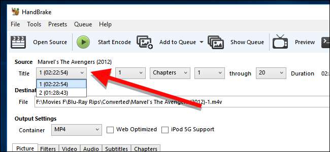 Когда Handbrake завершит сканирование файлов, вы увидите окно, подобное приведенному ниже. Если вы одновременно сканировали несколько фильмов, вы можете выбрать, какой из них хотите преобразовать, щелкнув раскрывающееся меню «Заголовок» в разделе «Источник».