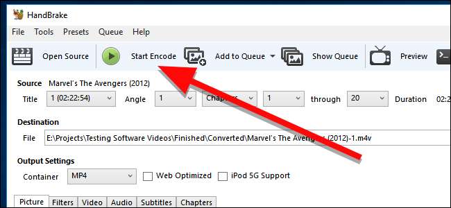 Когда вы будете готовы к работе, нажмите зеленую кнопку «Начать кодирование», чтобы начать преобразование видео. Кроме того, вы можете нажать «Добавить в очередь» и перейти к следующему отсканированному заголовку, а затем нажать зеленую кнопку «Начать очередь», когда закончите выбирать предустановки для всех своих фильмов.