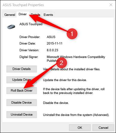 Щелкните вкладку «Драйвер» в верхней части окна и нажмите «Откатить драйвер».