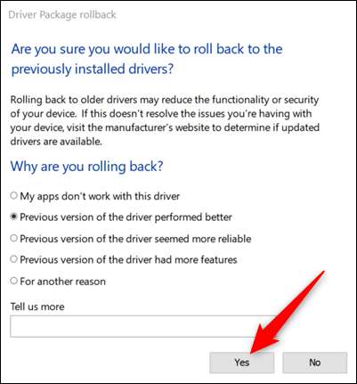 Windows выдаст предупреждение и спросит вас, почему вы выполняете откат к предыдущей версии драйвера. Щелкните ответ, а затем нажмите «Да». Если вы чувствуете необходимость, вы можете оставить подробный ответ в поле «Расскажите нам больше», расположенном в нижней части окна.