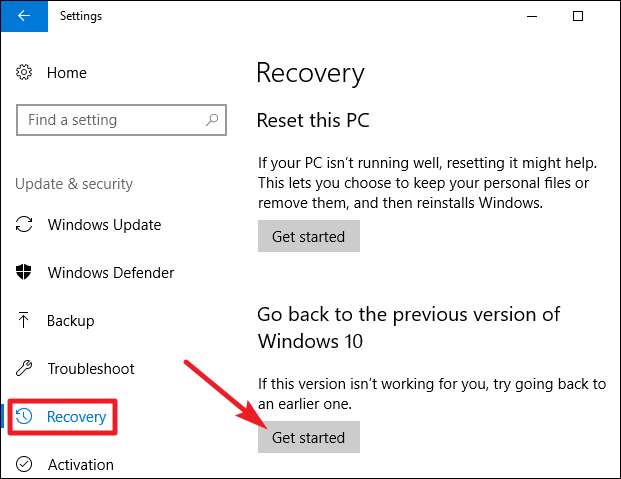 На экране «Обновление и безопасность» перейдите на вкладку «Восстановление», а затем нажмите кнопку «Начать» в разделе «Вернуться к более ранней сборке».