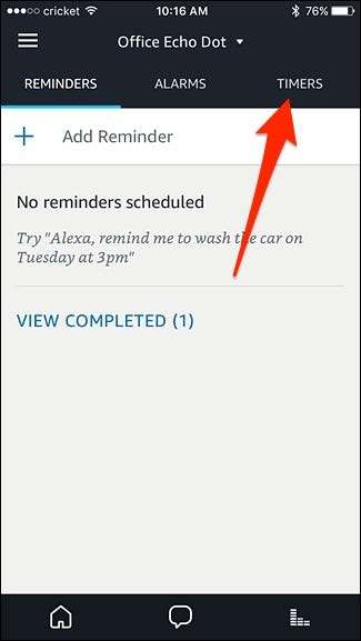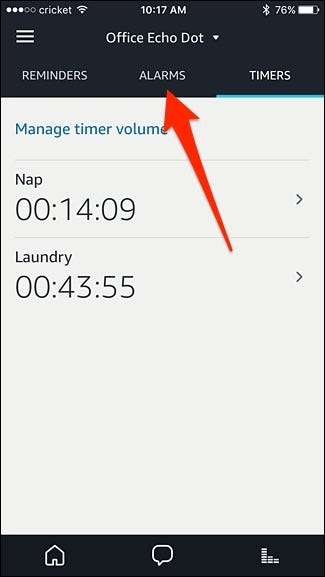 Чтобы переключить устройства Echo (если в вашем доме несколько устройств Echo), нажмите на направленную вниз стрелку вверх и выберите устройство Echo, которым вы хотите управлять. Таймеры и будильники специфичны для каждого устройства Echo и, к сожалению, не синхронизируются между несколькими устройствами.