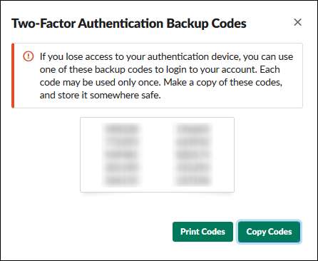 Slack отобразит панель резервных кодов, которые вы можете использовать для доступа к своей учетной записи, если вы потеряете свой телефон. Храните копию этих кодов в надежном месте (где, разумеется, не требуется доступ к телефону).