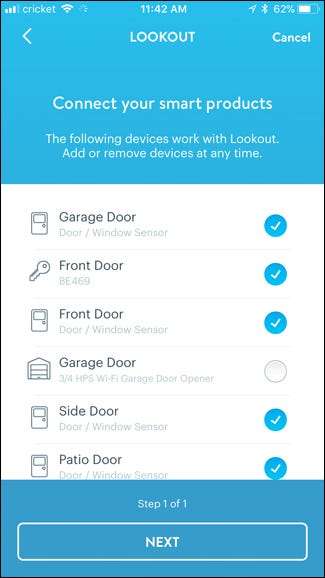 Затем приложение просмотрит все ваши устройства, подключенные к хабу Wink, и отобразит те, которые работают с Lookout. Выберите каждый из них, который вы хотите включить, и нажмите «Далее».
