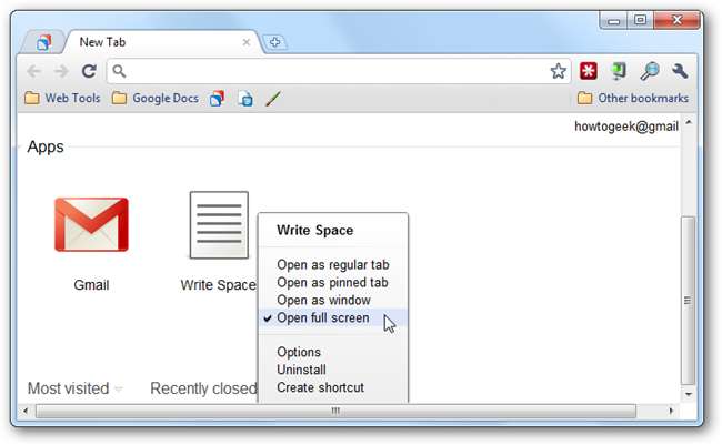 Некоторые приложения лучше работают в полноэкранном режиме, например, приложение Write Space - вы можете щелкнуть его правой кнопкой мыши и выбрать «Открыть в полноэкранном режиме»…