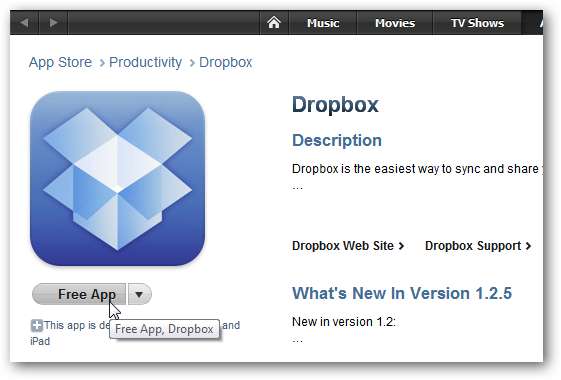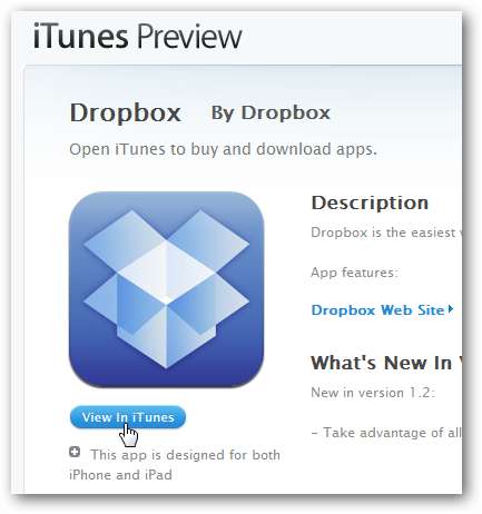 Сначала вам нужно установить приложение Dropbox, и есть несколько способов сделать это. Здесь мы сначала посмотрим, как получить его на свой компьютер через iTunes. Перейдите на сайт предварительного просмотра iTunes в Dropbox (ссылка ниже) и нажмите Посмотреть в ITunes .