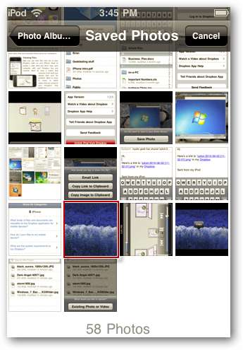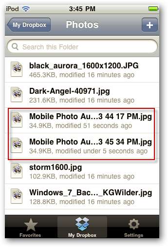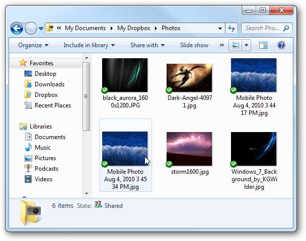 Теперь он доступен на всех компьютерах и портативных устройствах, на которых установлен Dropbox. Здесь мы получаем доступ к тому, что мы добавили с iPod Touch на нашем домашнем компьютере. Обратите внимание, что он добавляет Мобильная фотография к имени файла, что удобно, чтобы узнать, откуда пришли файлы.