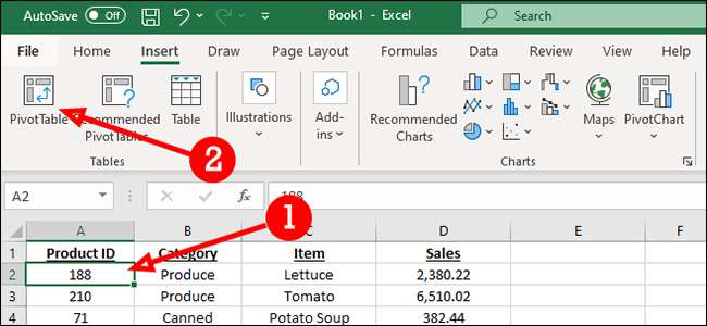 Нажмите внутри любой ячейки в наборе данных. На вкладке «Вставка» нажмите кнопку «PivOpotable».