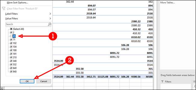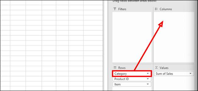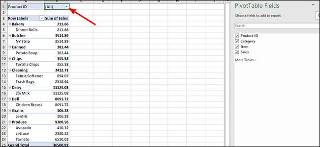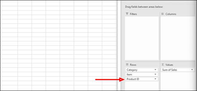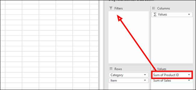 После открытия мы собираемся очистить данные немного. В нашем примере нам не нужен наш идентификатор продукта, чтобы быть суммой, поэтому мы переместим это из поля «Значения» в нижней части в раздел «Фильтры» вместо этого. Просто нажмите и перетащите его в новое поле и не стесняйтесь экспериментировать здесь, чтобы найти формат, который лучше всего работает для вас.