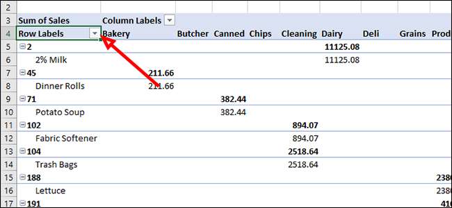 Мы не продаем много ужинов, поэтому мы решили прекратить их и удалить идентификатор продукта из нашего отчета. Для этого мы нажмем стрелку рядом с «рядными метками», чтобы открыть раскрывающееся меню.