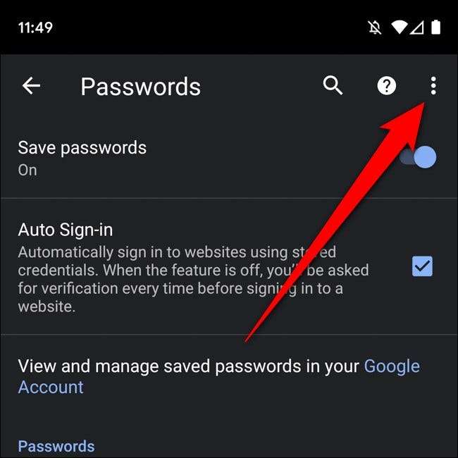 Если вы удаление вашей учетной записи Google и хотите сохранить сохраненные пароли, вы можете экспортировать все для просмотра в другом месте. Начните с меню паролей (Chrome> Три точки> Настройки> Пароли), а затем нажмите на три точки в правом верхнем углу.