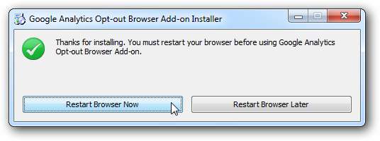 После этого надстройка автоматически загрузится и установится. Если вы используете Vista или Windows 7, вам, возможно, придется утвердить запрос UAC для завершения установки. Затем нажмите Перезагрузите браузер сейчас для запуска надстройки и защиты ваших данных от Google Analytics.