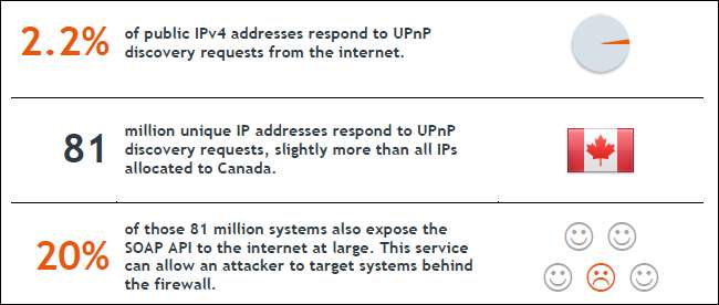 Существует около 81 миллиона уникальных IP-адресов, которые предоставляют функциональность UPnP из Интернета, и более 6900 различных устройств потенциально уязвимы, по крайней мере, для взлома извне. Теоретически это означает, что ваш маршрутизатор может быть взломан для перенаправления портов из внешнего мира, что оставляет вас уязвимым для дальнейшего взлома.