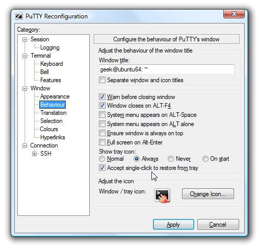 Первый параметр, который я бы порекомендовал, - это установить флажок «Принять одно нажатие для восстановления из лотка», что значительно упрощает восстановление окна PuTTY.