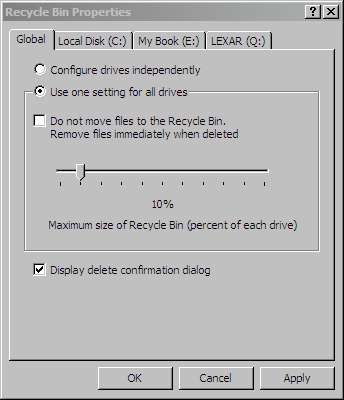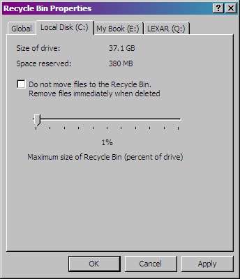 Если на вашем жестком диске мало места, возможно, вы захотите уменьшить размер корзины. По умолчанию Windows XP резервирует для корзины 10% вашего жесткого диска. Вы можете сэкономить до 3 ГБ пространства, если измените размер корзины до 1% на жестком диске 40 ГБ. Вы можете изменить размер отдельного диска или всех их глобально.