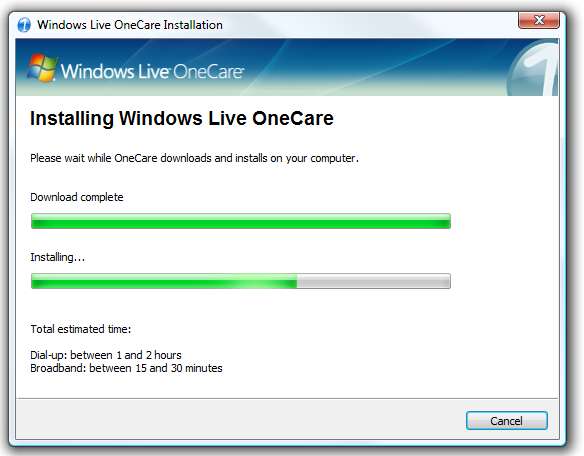 Затем вам будет предложено прочитать и принять лицензионное соглашение и Условия использования. После этого будет загружена и установлена Windows Live OneCare. С моим DSL-подключением это заняло около 10 минут.