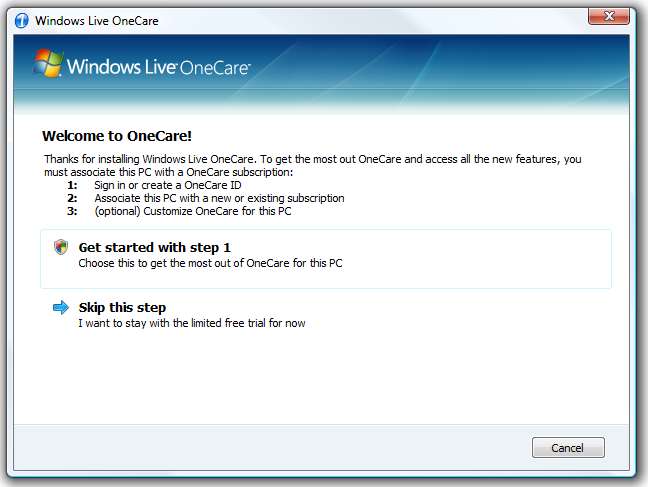По возвращении вы получите своего рода приветственный экран. Здесь вы можете выбрать шаг 1, который потребует от вас покупки лицензии (49,95 долларов США), или использовать ограниченную пробную версию, которую я собираюсь выбрать. Поскольку это мой первый опыт работы с Windows Live OneCare, я хочу протестировать все в течение 90-дневной пробной версии.