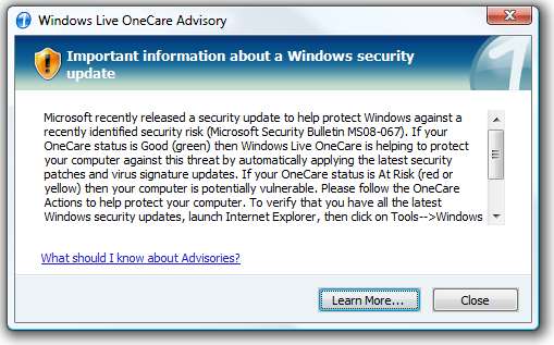 Периодически будут появляться сообщения об обновлениях безопасности от Microsoft, которые еще не были установлены. Они содержат краткое подробное описание обновления, а также позволяют подключиться к веб-сайту Microsoft для получения дополнительных сведений.