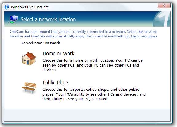 Вы можете вспомнить следующие всплывающие настройки, которые вы выбрали при первой установке Vista. OneCare хочет выбрать тип сетевого подключения, к которому подключен ПК.