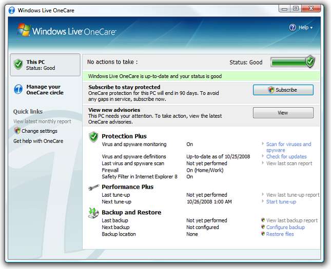 Второй раз очарование, Windows Live OneCare готов к прокатке и уже работает.