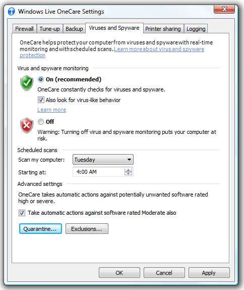 Настройки Windows Live OneCare позволяют настраивать различные аспекты работы различных компонентов защиты.