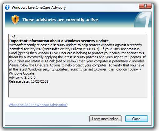 Еще одна вещь, которую я сразу заметил, - это несколько всплывающих сообщений и других сообщений, указывающих на то, что, по мнению OneCare, не обеспечивает безопасности в моей системе.
