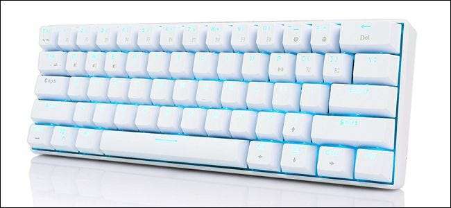 В ДРЕВО Калибур (60 долларов США) использует нечетный макет, ширину без клавиш, которая отрезает строку выделенной функции для длинного тонкого корпуса. Тем не менее, он предлагает невысокую цену с полными светодиодами RGB, хотя программируемые огни и клавиши, похоже, отсутствуют. Переключатели Cherry Clone предлагаются в синем, коричневом, красном и черном вариантах. С широкая доступность на Amazon и низкая цена в 60 долларов, это достойный вариант, если вы хотите что-то меньше полноразмерного, но не хотите компромиссов 60% макета. К сожалению, он доступен только в серо-белом цвете корпуса, но запасные колпачки для раскладки ANSI легко найти.