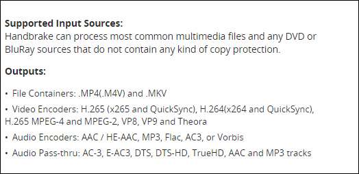 Ручной тормоз - это конвертер видео с открытым исходным кодом, доступный для систем на базе Windows, Mac и Linux. Он поддерживает широкий спектр видео и аудио форматов для преобразования, полный список которых представлен на изображении ниже.