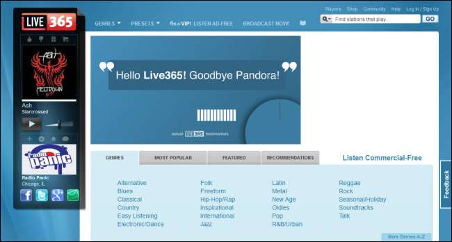 Live365 предлагает широкую радиосеть высококачественной потоковой музыки, разговоров и аудио в более чем 260 жанрах. Радиосеть Live365 транслирует музыку таких исполнителей, как Пэт Метени, Джонни Кэш и Карлос Сантана. Они также предлагают доступ к общественным радиостанциям и станциям, запрограммированным в разных стилях отдельными ди-джеями. Live365 предоставляет отдельным артистам и организациям удобную платформу для продвижения своей музыки и создания собственных интернет-радиостанций.