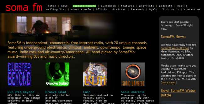 SomaFM это поддерживаемая слушателями, бесплатная интернет-радиостанция без рекламы, которая получает более 5,8 миллионов «часов слушателей» в месяц. Их цель - познакомить своих слушателей с новой прекрасной музыкой, которой нет на коммерческом радио.