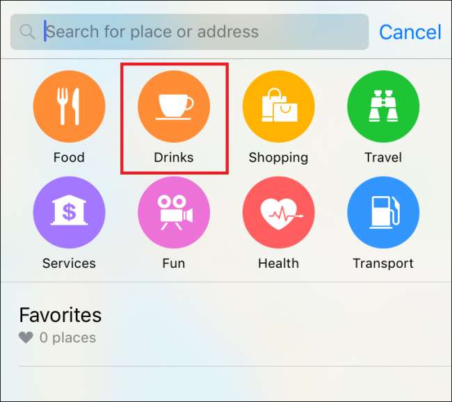 Если и есть одна категория, которую можно легко перенести на Apple Maps через Google, то это именно эта. Apple Maps работает так же, как собственный мини-Yelp, выпуская список предложений, основанный на широких категориях, таких как «Еда», «Напитки» или «Развлечения», каждый раз, когда вы нажимаете на строку поиска.