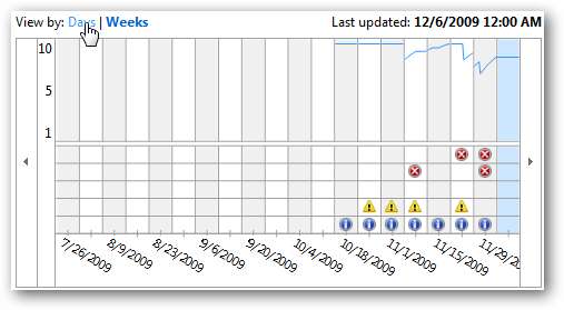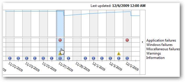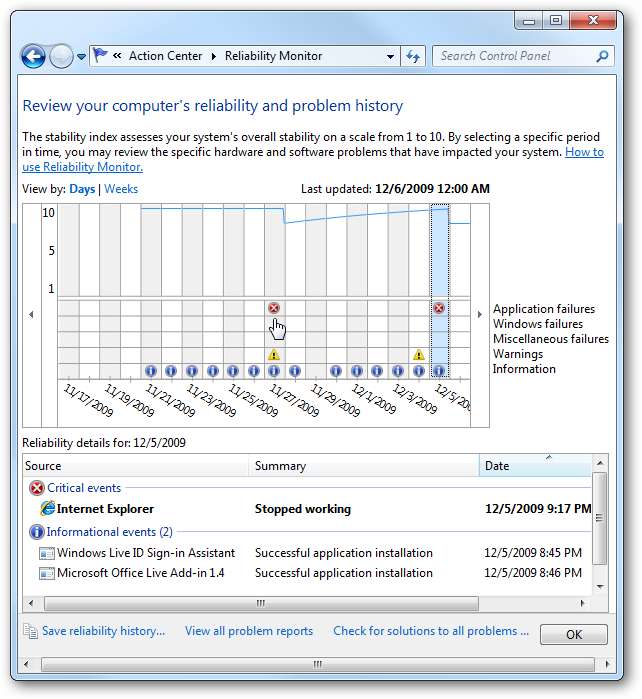 На диаграмме вы увидите значки предупреждений и сбоев по шкале от 1 до 10. (1 - наименее стабильный и 10 - самый стабильный). Щелкните дату, когда произошла ошибка, чтобы просмотреть подробности.