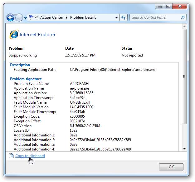 В разделе «Подробная информация о проблеме» указывается, в чем проблема, дата и время ее возникновения, а также приводится описание проблемы. Вы можете скопировать данные в буфер обмена на случай, если вам потребуется отправить их в службу технической поддержки по электронной почте.