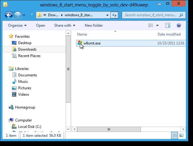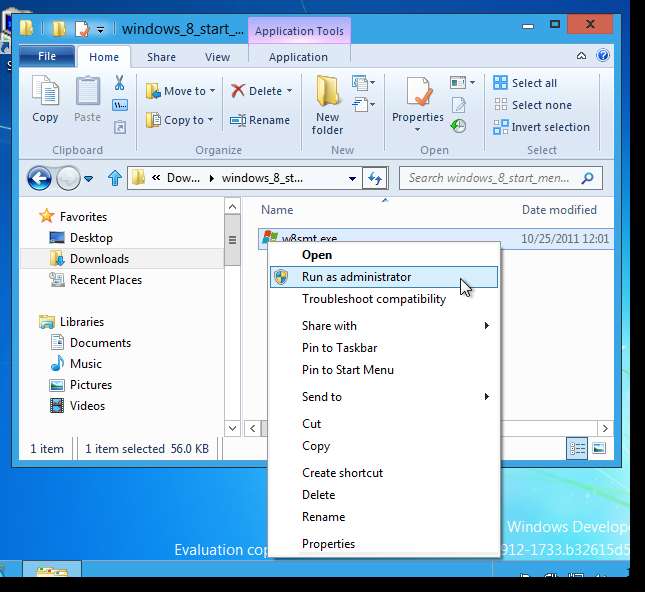 Чтобы использовать переключатель меню «Пуск» в Windows 8, вы должны запустить его от имени администратора. Извлеките загруженный файл .zip, щелкните правой кнопкой мыши файл .exe и выберите «Запуск от имени администратора» во всплывающем меню.