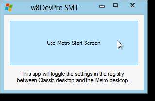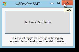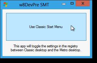 Чтобы запустить переключатель меню «Пуск» в Windows 8, дважды щелкните тот же файл w8smt.exe, который вы запускали ранее. Появится небольшое диалоговое окно с одной большой кнопкой. Если вы в настоящее время используете пользовательский интерфейс Metro, на кнопке написано «Использовать классическое меню запуска». Нажмите кнопку, чтобы скрыть пользовательский интерфейс Metro и использовать классическое меню «Пуск» Windows 7, проводник и диспетчер задач.