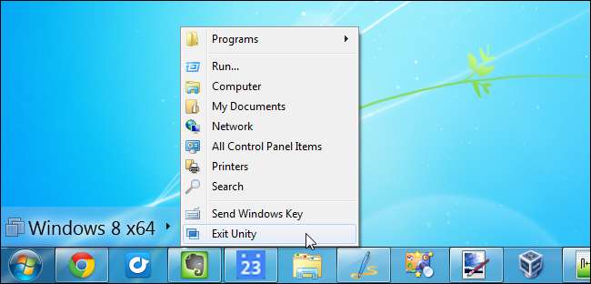 Чтобы отобразить меню «Пуск» на хосте Windows, наведите указатель мыши на кнопку «Пуск». Чтобы отобразить меню приложений на хосте Linux, наведите указатель на верхний левый угол экрана. В этом меню выберите Exit Unity, чтобы отключить режим Unity.