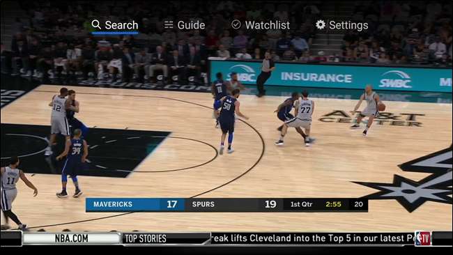 Во время просмотра телепередач в прямом эфире вы также можете нажать «вверх» на пульте дистанционного управления (мы тестировали на Fire TV), чтобы вызвать своего рода быстрое меню с параметрами для поиска, руководства, списка просмотра и настроек. Нажатие на пульте дистанционного управления вызывает полное меню.
