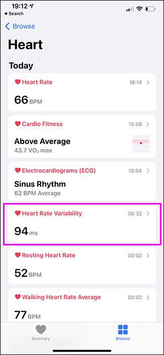 Чтобы просмотреть данные, откройте приложение «Здоровье» на вашем iPhone и перейдите в Browse & GT; Сердце и GT; Изменчивость частоты сердечных сокращений.
