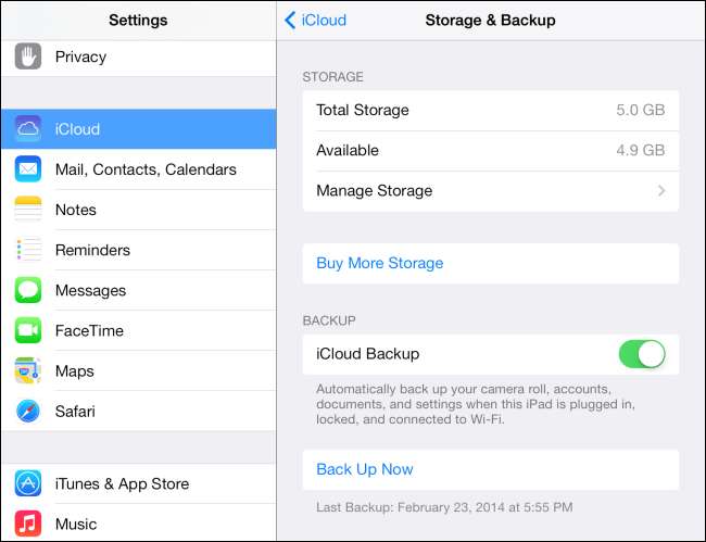 Коснитесь параметра «Хранилище и резервное копирование» в нижней части панели iCloud, чтобы просмотреть дополнительную информацию о процессе резервного копирования. На этом экране вы можете увидеть, сколько места в хранилище iCloud у вас есть - по умолчанию это 5 ГБ свободного места. Переключатель резервного копирования iCloud позволяет выбрать, будет ли ваше устройство выполнять резервное копирование в iCloud.