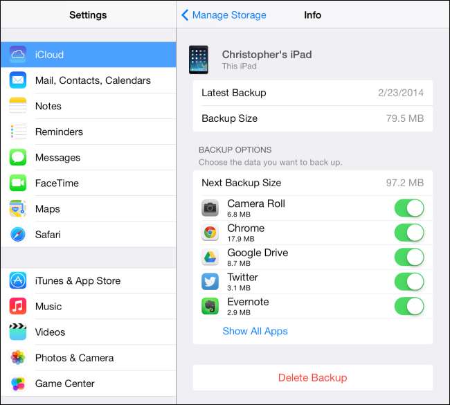 Коснитесь устройства, чтобы просмотреть более подробную информацию о последней резервной копии. Вы можете точно видеть, какие приложения используют больше всего места. Чтобы освободить место, вы можете отключить резервное копирование для одного из приложений. При следующем резервном копировании iCloud не будет создавать резервные копии отключенных здесь приложений, что позволяет сэкономить место. Вы также можете удалить самую последнюю резервную копию, нажав «Удалить резервную копию».