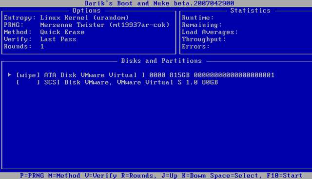 Если вы действительно параноик, хотите запустить другой тип очистки или просто возитесь с параметрами, вы можете выбрать F3 или нажать Enter в приглашении, чтобы перейти к экрану расширенного выбора. Здесь вы можете выбрать, какой именно диск очистить, или нажмите клавишу M, чтобы изменить метод.