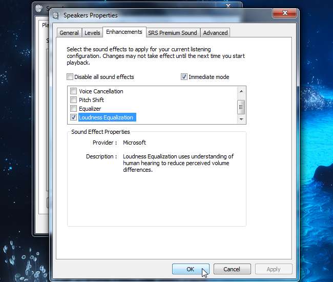 Klicka över till fliken Förbättringar och aktivera kryssrutan Loudness Equalization i listan. Om du inte ser fliken Förbättringar stöds inte din ljudmaskinvara.