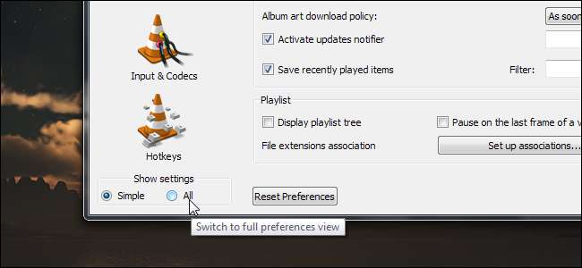 Klicka på alternativet Alla under Visa inställningar för att visa alla VLC: s inställningar.