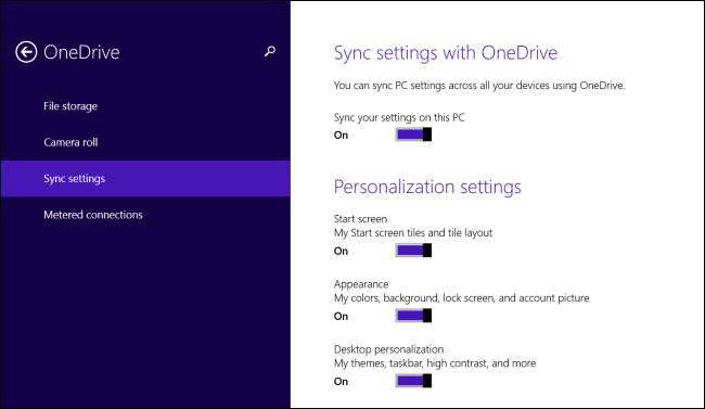 Windows 8 och 8.1 gör att du kan säkerhetskopiera en mängd olika systeminställningar - inklusive personalisering, skrivbord och inmatningsinställningar. Om du är logga in med ett Microsoft-konto , Säkerhetskopiering av OneDrive-inställningar aktiveras automatiskt. Denna funktion kan styras under OneDrive> Synkroniseringsinställningar i appen PC-inställningar.