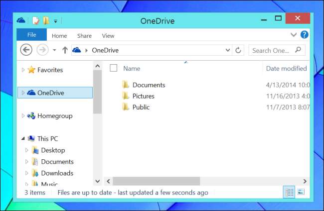 OneDrive - tidigare känd som SkyDrive - var läggs till på Windows-skrivbordet i Windows 8.1 . Spara dina filer här så lagras de online kopplade till ditt Microsoft-konto. Du kan sedan logga in på valfri annan dator, smartphone, surfplatta eller till och med via webben och komma åt dina filer. Microsoft vill att typiska PC-användare "säkerhetskopierar" sina filer med OneDrive så att de kommer att finnas tillgängliga på alla enheter.