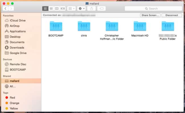 När du öppnar Finder ser du alla Mac-datorer du har loggat in och aktiverat Tillbaka till min Mac på under Delad i sidofältet. Klicka på en Macs namn för att komma åt dess filer - du kan bläddra i hela dess enhet och ta en fil från Finder-fönstret.